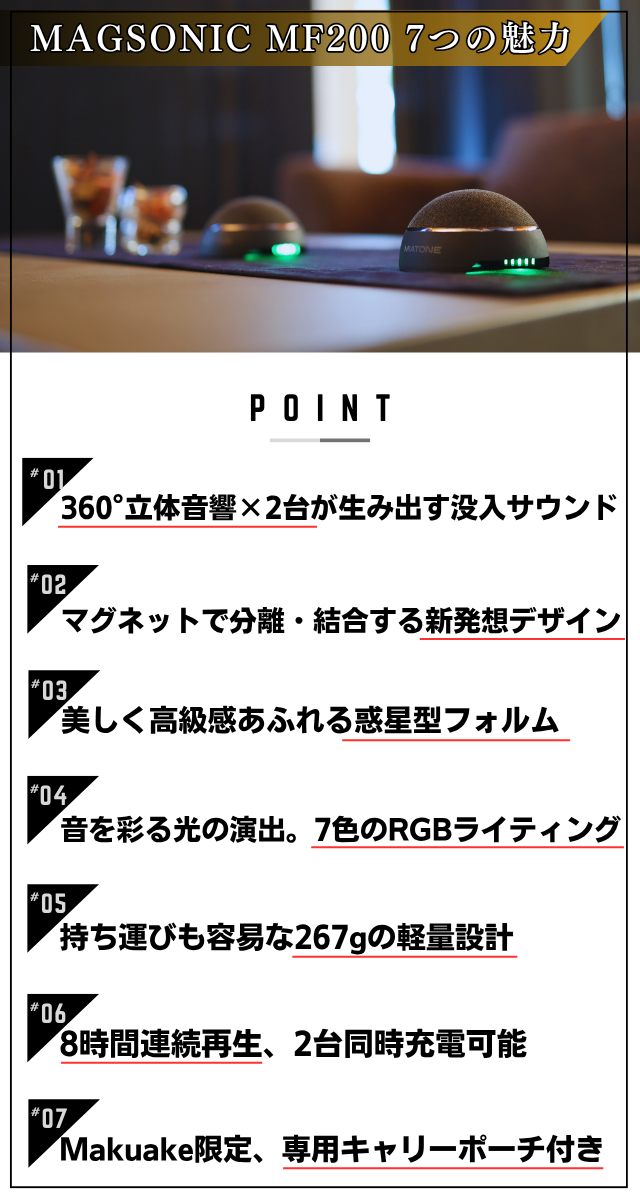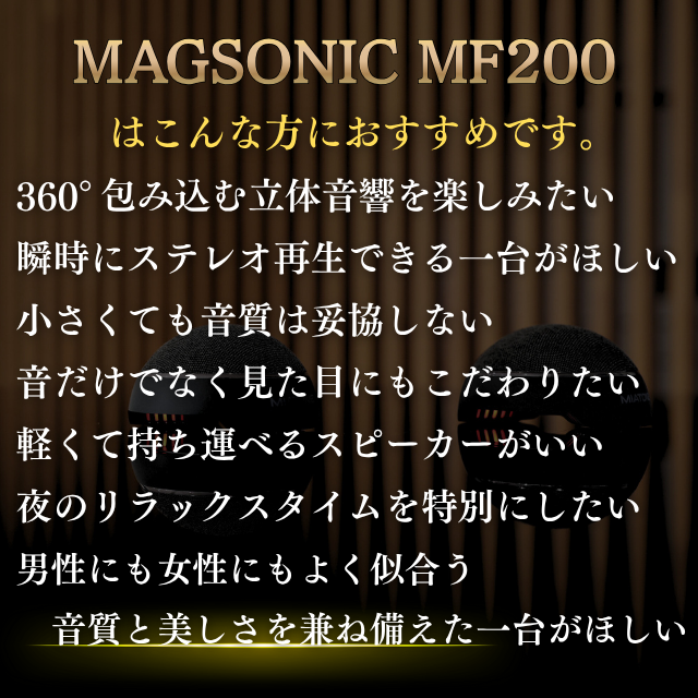 2025年11月、新たに登場した2in1惑星型スピーカー『MAGSONIC MF200』の特長のひとつが、独自開発の半球形デザインが生み出す、圧倒的没入サウンド。