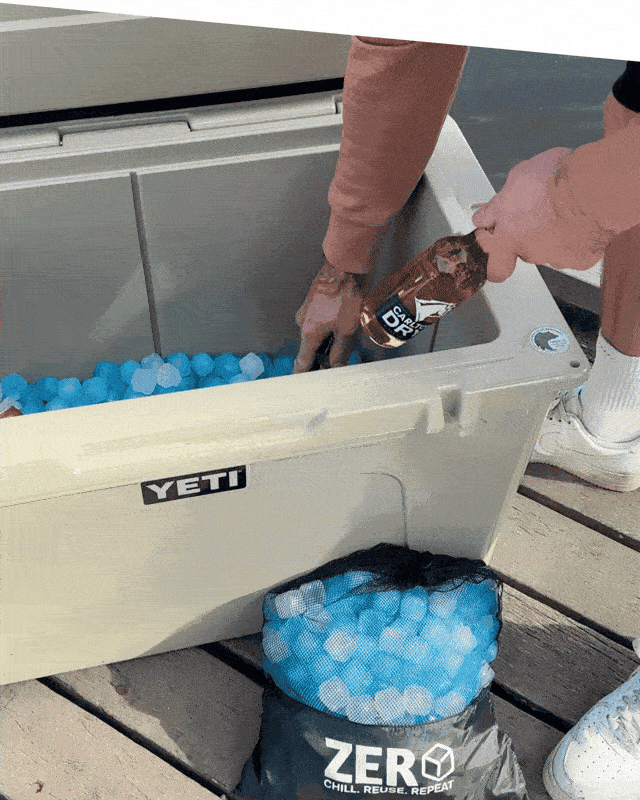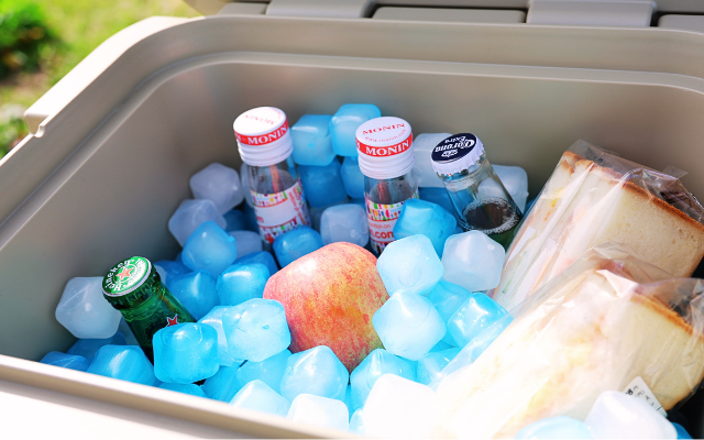 キューブ状の『ZERO ICE』はひとつひとつが小さくクーラーボックスの隙間に入り込むから、飲み物も食材もバッチリ冷却します。